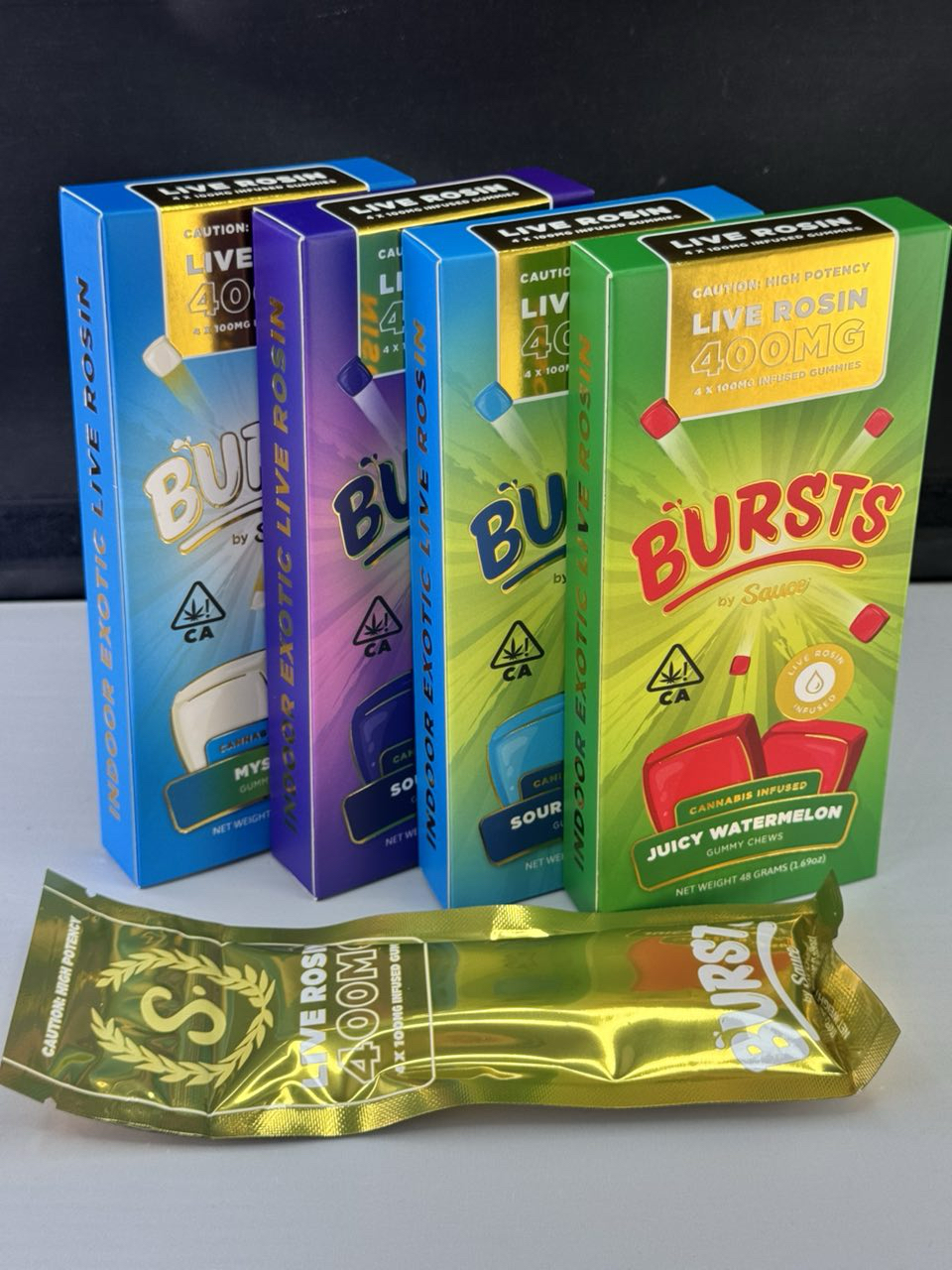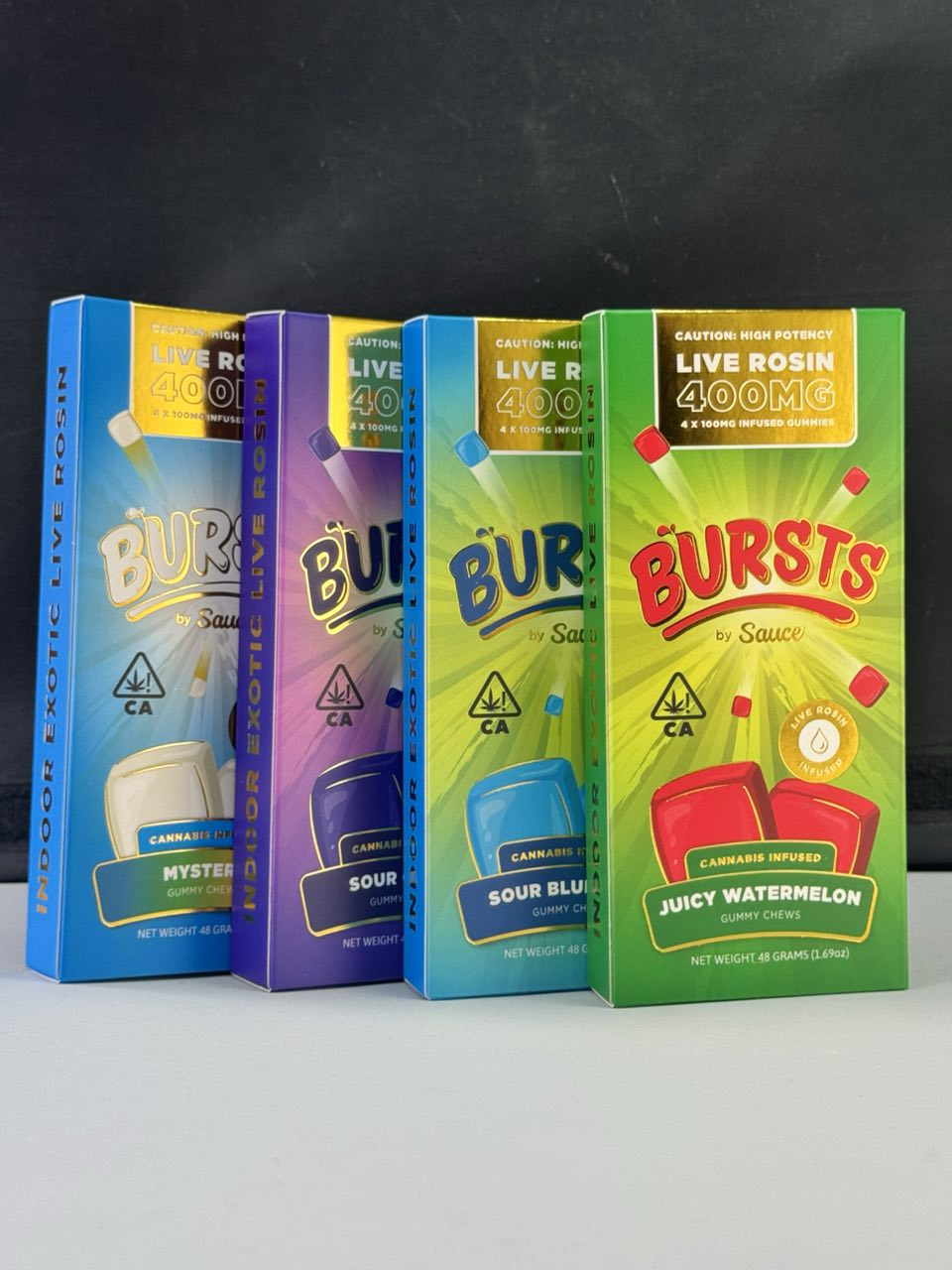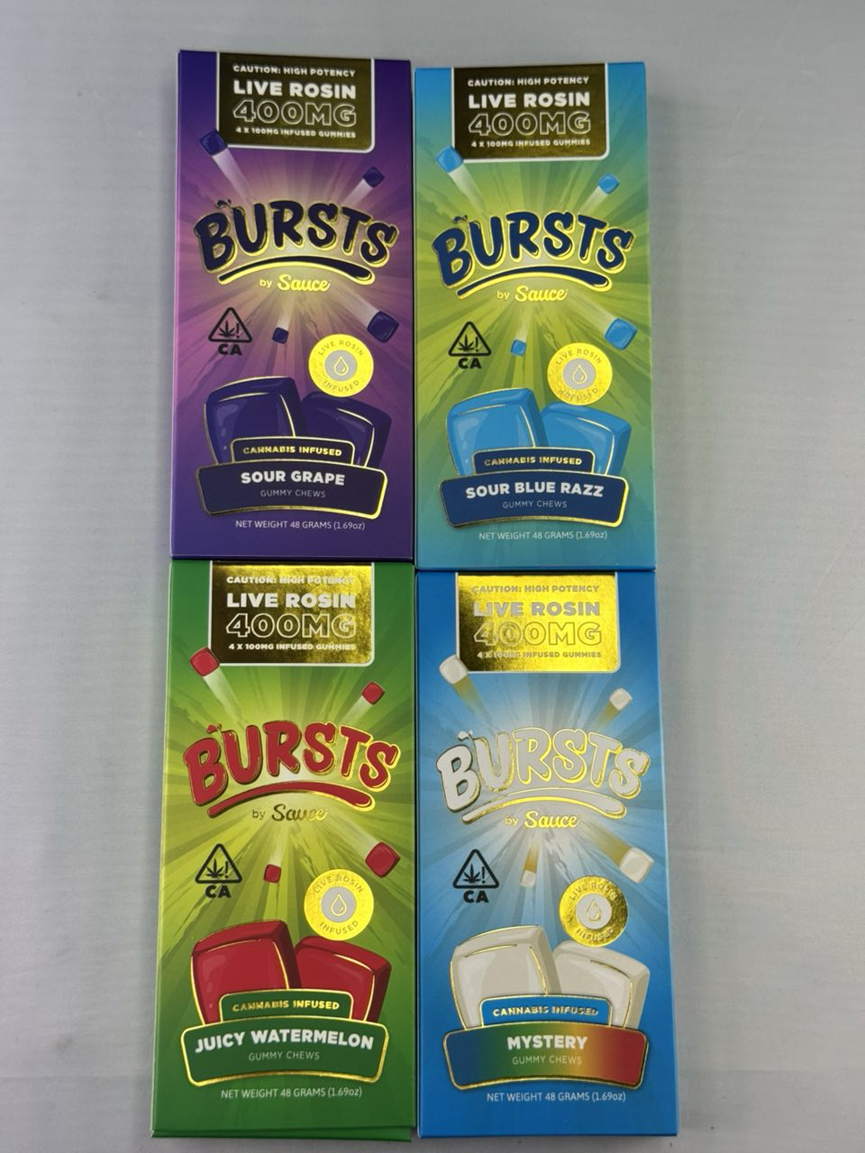 - Burst by Sauce offers high‑potency live resin (rosin) infused gummies, typically grouped as a 4-pack totaling 400 mg THC (i.e. 100 mg per gummy)