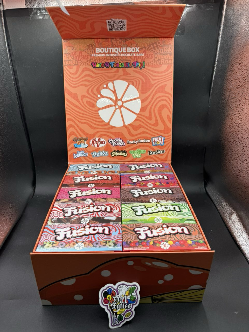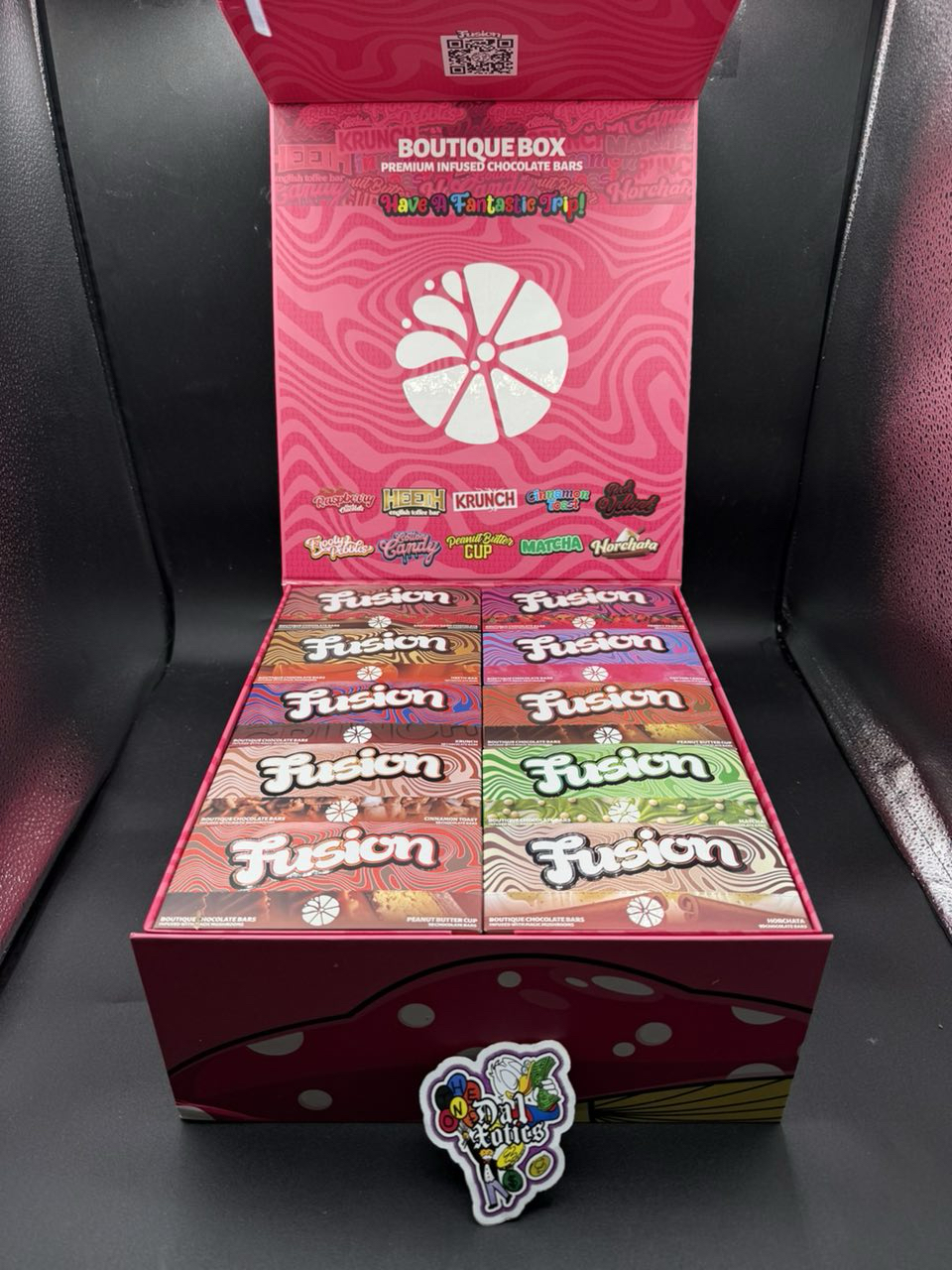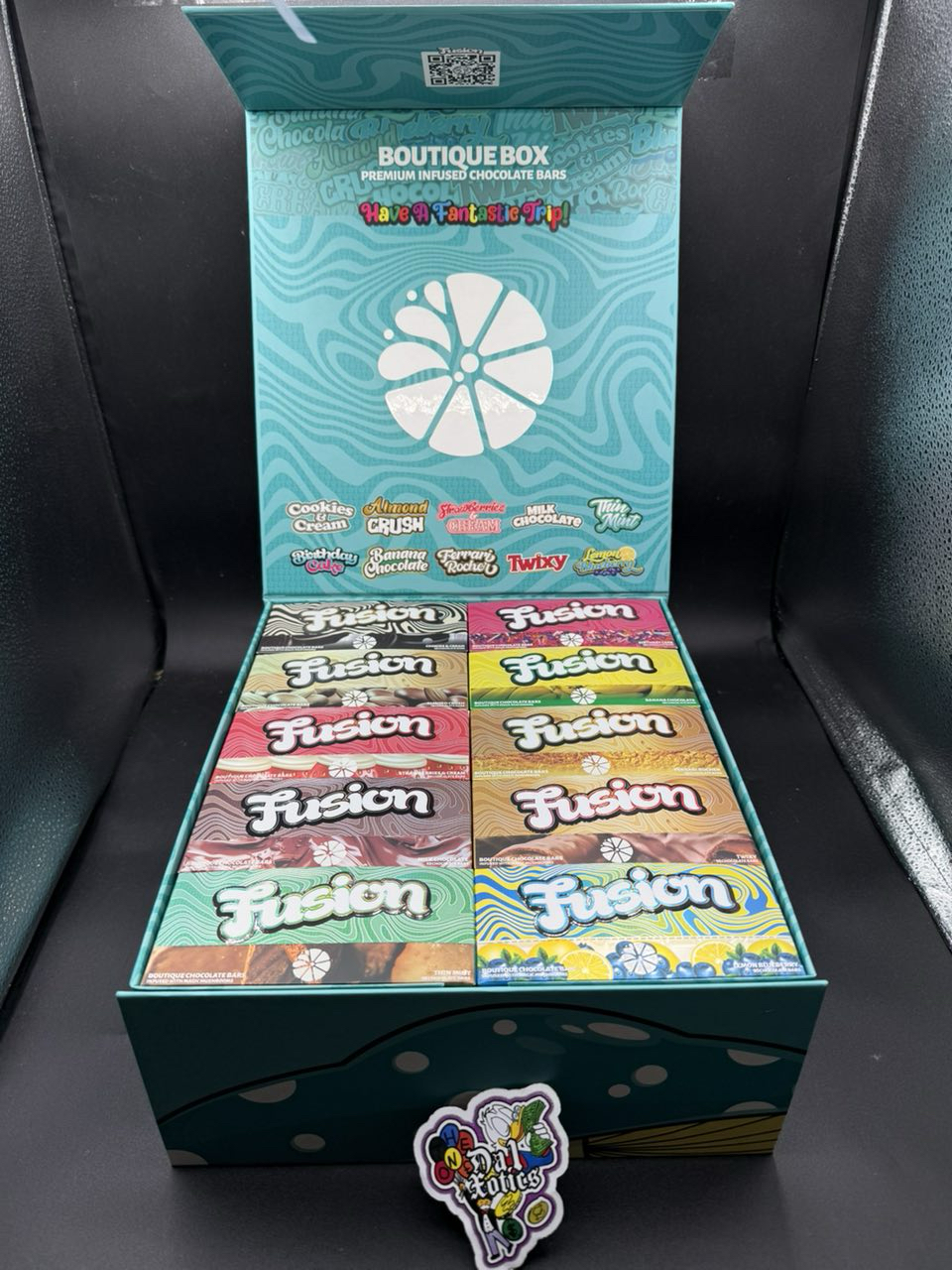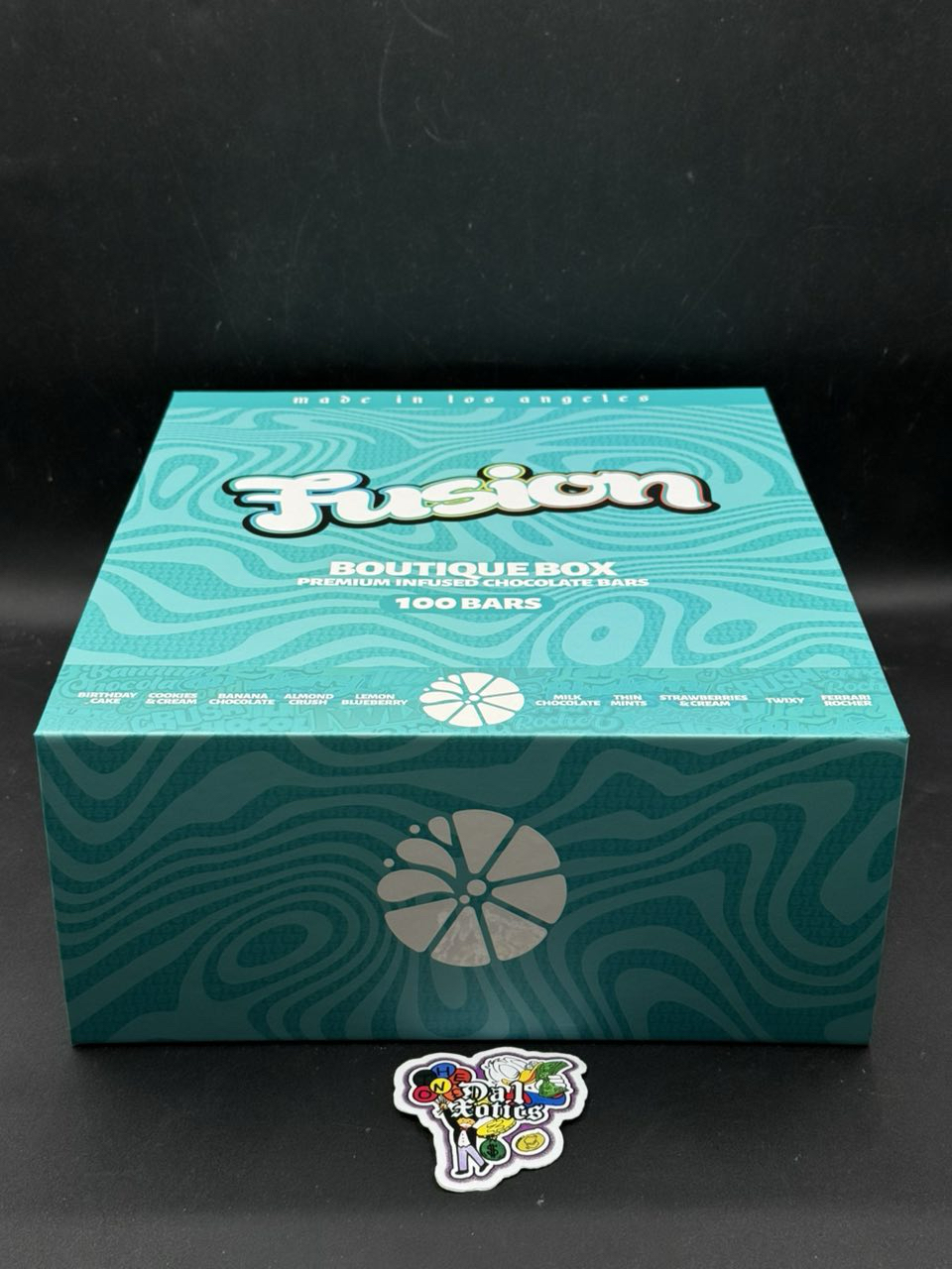 Indulge in luxury with the Fusion Boutique Box Premium Infused Chocolate, a meticulously crafted collection of 100 gourmet cannabis-infused chocolate bars. Designed for connoisseurs who crave elegance, potency, and flavor, this premium assortment delivers an unforgettable edible experience.