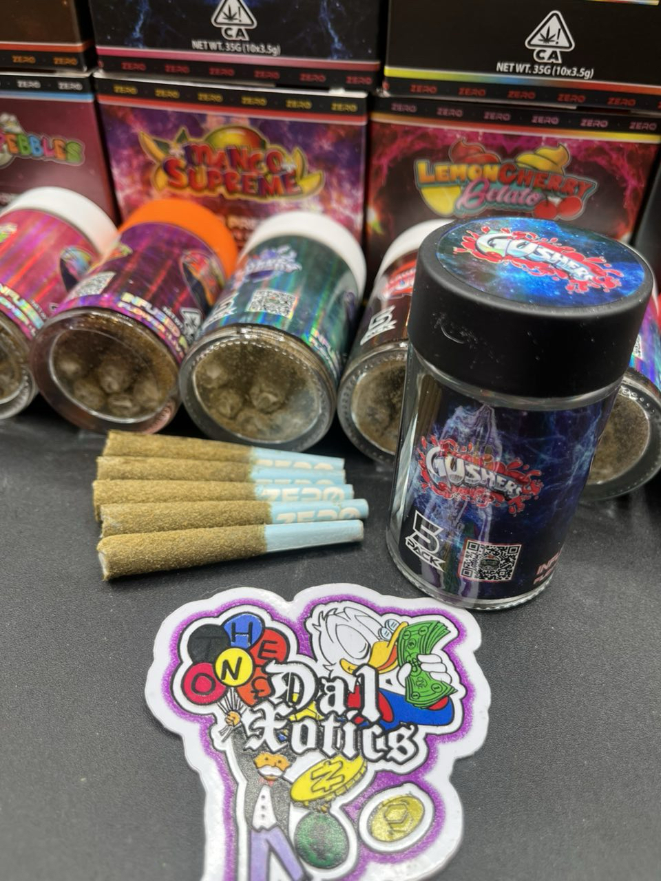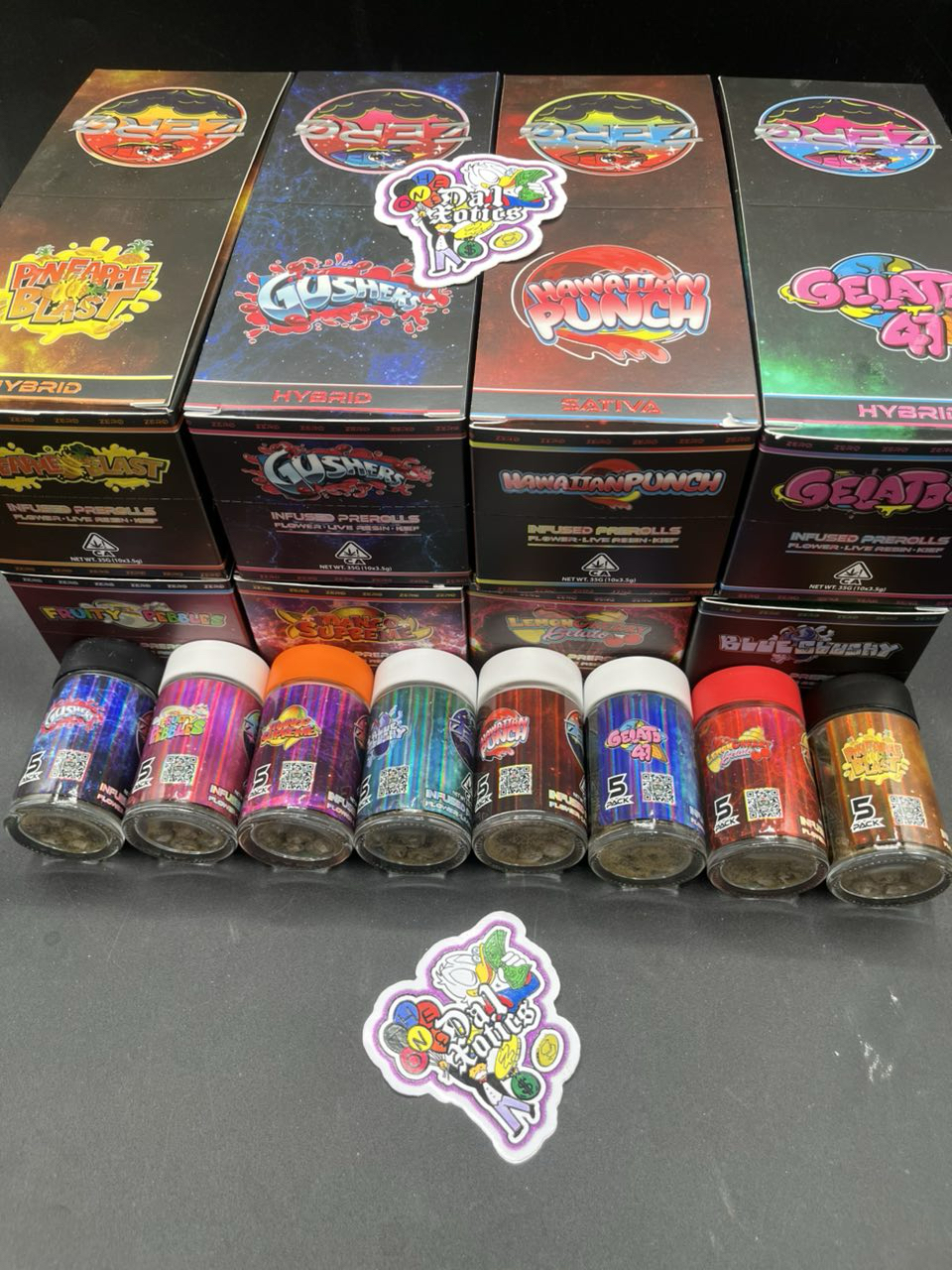 | Flavors | PINEAPPLE BLAST (HYBRID), GUSHERS (HYBRID), HAWAIIAN PUNCH (SATIVA), GELATO 41 (HYBRID), FRUITY PEBBLES, MANGO SUPREME, LEMON CHERRY GELATO, BLUE SLUSHY, ZKITTLES, SFV OG, DIRTY SPRITE, ALIEN OG, BANANA RUNTZ, BLUE DREAM, 10 Mixed, 25 Mixed, 50 Mixed, 100 Mixed |